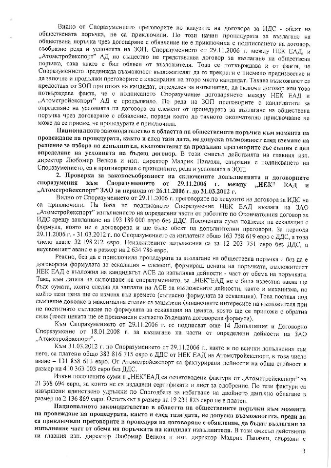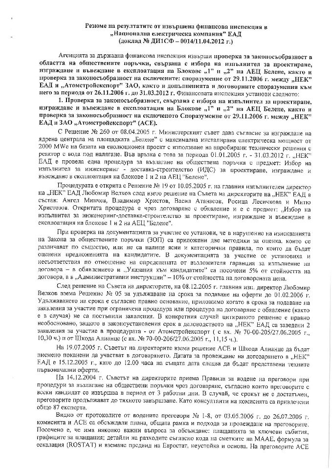 "Преди минути публикувах на стената си резюме на доклада на Агенцията за държавна финансова инспекция за закононарушения по т.н проект АЕЦ"Белене". Доклада е пропуснал няколко години измами и далавери целящи да бъде избрана само руска технология и да не се допусне каквато и да е възможност за някакъв друг избор. Независимо от това, дори и в този си вид, този доклад показва скандалното и невъобразимо нагло поведение на самозабравилите се организатори на това престъпление. За мен е непонятно, защо Прокуратурата не е привлякла като обвиняеми описаните лица след като в този доклад е ясно и конкретно описано как те са извършвали стъпка по стъпка пъкленото си дело. А ние, гражданите на България плащаме и сега техните измами..."