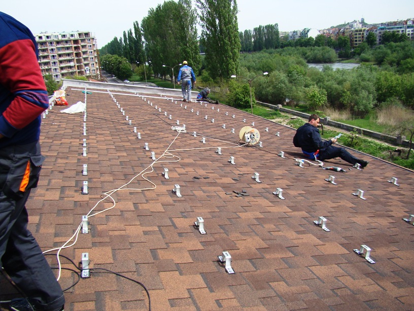 1. Тъй като физически нямахме достъп до гредите през подпокривното пространство, трябваше да измислим начин за закрепване на носещите скоби буквално на сляпо. Близко до ума беше да използваме металотърсач и такъв бе закупен с цел експерименти. Направихме опитна постановка в Габрово и няколко дена си играхме с технологията на търсене на гредите. Освен това пробвахме различни видове скоби и различни начини за тяхното закрепване. Задачата беше много сложна предвид хилядите метални гвоздеи, с които са зачуквани битумните керемиди. Имаше участъци, в които металотърсача беше направо безполезен, защото навсякъде детектираше метал.
