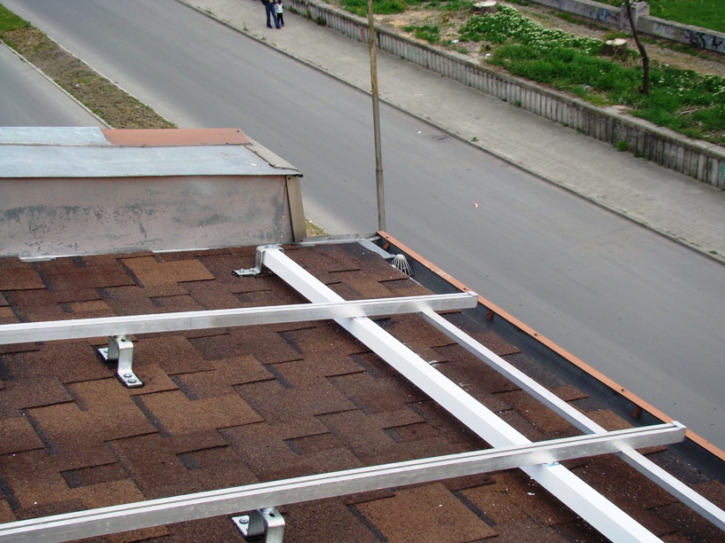 Втория, по-тънък алуминиев профил отпред, няма носеща способност. Той е монтиран с една единствена цел - осигуряване на надежден електрически контакт между всички носещи профили. Използвали сме алуминиев винкел 40х20х4. Със същия винкел е направен електрически контакт и в задния край на профилите. По този начин сме образували пълен електрически контур с двойно подсигуряване. Всичко това е направено с цел гарантиране на надеждното заземяване на рамките на всички модули, тъй като инверторите са безтрансформаторни.