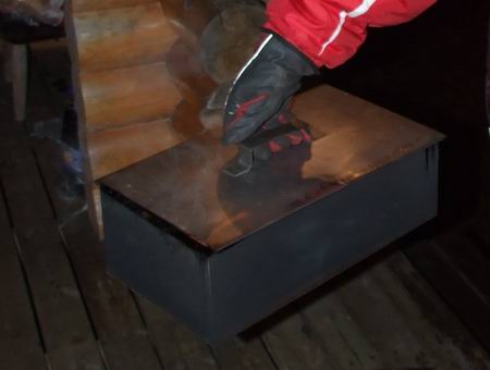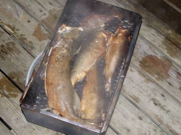 ...рецептата е от Финландия - говоря за страната, не за водката де...Та почиствате рибетата,поосолявате, а след това се поставя в ламаринена кутия. На снимките рибата обаче е щука и чудски сиг, но пъстървата и скумрийката идеално се вписват в картинката. Тази кутия е с капак отгоре, който се плъзга и има дръжка. На дъното се насипват стърготини /ситен талаш/ от елша. Те се продават в магазина там. В нашенско ги заместваме с чамов талаш, като колега ми е казвал, че и букова шума става - ситуации разни, какво да правиш... Върху този талаш поръсвате обилно захар. Два пръста над дъното поставяте метална решетка, върху която се нарежда почистената риба. След това кутията се затваря с капака и се оставя върху барбекюто, което предварително бива запалено. Така рибата стои близо час.