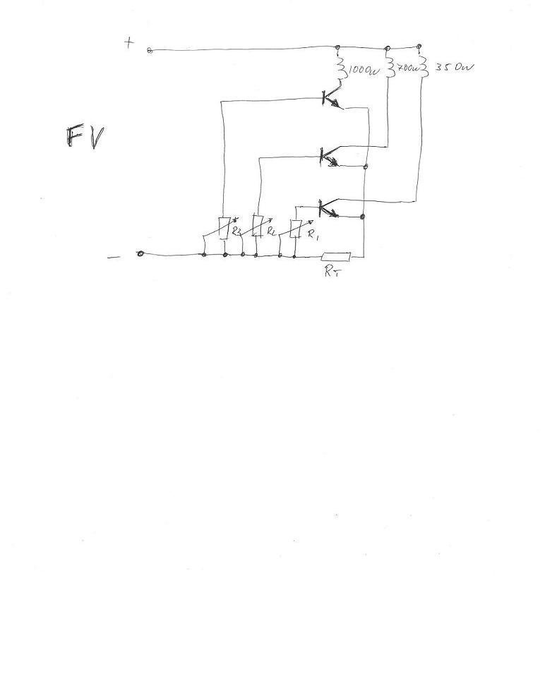 Идеята е следната,при повишаване на напреженовия пад върху резистора Rт(което значи повишаване на подаваната мощност),да се отпушват съответните транзистори,като праговете на отпушване се регулират съответно с R1,R2 и R3.Би следвало при добра настройка пада върху резистора Rт да е между 3 и 5 волта.Което значи,че разсейваната мощност от него трябва да е максимум 50 вата.....