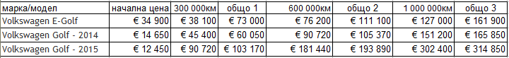 Съпоставяне на Volkswagen E-Golf и Volkswagen Golf - модел 2014 с начални цени съответно 34 900 € и 14 650 € и разход за зареждане при три етапа на базата на средна цена на EURO 95 и цена в еврозоната на електроенергия за индустрията ЕА17.