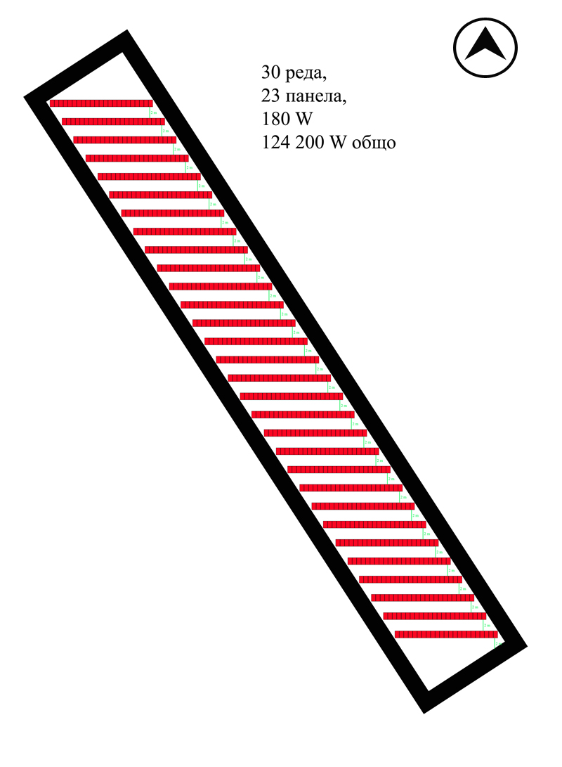 смятал съм панелите да са разположени на един ред само. Панелите ще са с наклон от 30 градуса спрямо хоризонта и на разстояние редиците една от друга на около 2 метра. Предният ръб на панелите е на 0,5 метра подвигнат над земята. Панелите са 180 ватови с размери 1,575 метра високи и 0,809 метра широки. Теренът е правилен правоъгълник, но не е насочен спрямо юга.