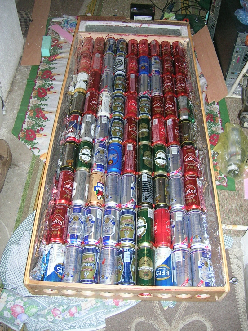 Използвах 162 бирени кутийки. Някои от тях изрязани изцяло двустранно, а на някои горната страна е направена на извити пластинки за допълнително турболизиране на въздушния поток. двата стиковани панела станаха с размер 3.70 Х 0.70 метра т.е. около 2.3 кв. метра.