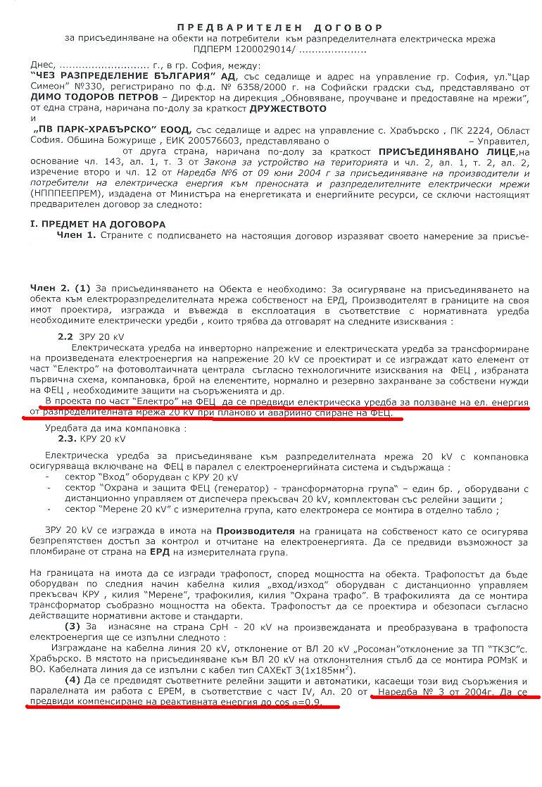 Искам да попитам следното нещо относно два абзаца от предварителния ми договор за присъединяване на парк .