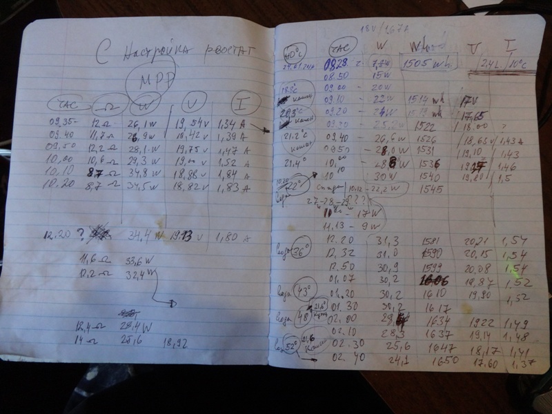 Колеги, днес 24 януари 2016г.имах късмет, че времето беше перфектно .Студено ,сутринта под нулата и след обяд около 2-3 градуса.Страхотно слънце, без едно облаче! Знаех от прогнозата за времето ,че днес ще е подходящ ден да продължа експеримента и вчера направих малка подготовка!Монтирах реостат 20 ома ,100 вата на една импровизирана поставка, в един кашон сложих пластмасова кана и термично грубо я изолирах . Напълних я с 2,4литра гореща вода 51 градуса от чешмата в 11 часа вечерта ,на сутринта в 7 часа беше се охладила до 35 градуса.За 8 часа загуби 31% !!!!Според този тест за мен изолацията на каната не е направена добре!Това са огромни загуби! По спомен за някой болери за 12 часа спада на температурата не надхвърля 5-10 градуса и то загряти на 65 градуса!Запоих един резистор 13 ома ,50 вата на два кабела и го потопих ниско до дъното в каната във вертикално положение.На охлаждане на въздух при 20 вата от панелчето този резистор се нагрява над 200 градуса!Както си спомняте от предните постове имам три засенчвания едното е сутрин от сграда ,второто от клоните на едно дърво и стълб ,точно на обяд сенките се виждат на снимките и третото , след обед отново от сграда!Прикачвам снимки на тефтера и снимки от опита .Числата не са много точни виждам дори грешки например за измерването в 9.50 с МРР съм записал 12,2а логично да е 11,2 ома.Докато записвам, меря или настройвам реостата данните се менят в малки граници а и се допускат грешки от бързане и недоглеждане !Да направя едно обобщение.Използвах товар 13 ома ,но се оказа, че около 10-12 ома(13 ома е настройка на централата за 800 средна слънчева радиация а 10- 12 ома вероятно за около 900 вата средна слънчева радиация) ще е по-добре с едни 3-5% за деня.Максималната МОМЕНТНА разлика в мощност с МРРТ(РЪЧНА НАСТРОЙКА НА РЕОСТАТА) и без него за целият ден от 8.30 сутринта до 3.30 след обяд е около 4,8вата!!! Като максималната разлика се получи в 10.10 ч. сутринта ( което малко ме озадачи, но го свързвам с околната температура и тази на панела и най-вече от засенчването, което не ми даде възможност за измерване в най-силния пек)и може да се види на тефтера на лявата страница ,написано е МРР.Това са около 12-13% разлика м/у панела с товар 13 ома и с настроен товар за максимална мощност !!!И забележете ,това е за период около 2,5-3 часа.През по-голяма част от ДРУГОТО ВРЕМЕ ПАНЕЛЪТ СИ РАБОТИ ПОД 6-7 % разлики м/у МРР и фиксирания товар!А ако малко променя фиксирания товар от 13 ома примерно на 10-12 ома тази разлика ще намалее!!!Това се вижда от измерванията че от 9.00 часа до 2 часа след настройка на товара винаги само с намаление на омовете имаме повишаване на мощността!Значи имаме резерв! В дневен мащаб разликите със и без МРРТ в добър слънчев ден се оказва , че реално могат да са под 7-10%!!!Централата за деня произведе от 8.30 ч.до 30.30 ч.160 ват часа !!! Ако се приравни за централа 1 киловат това е 5,28киловатчаса и както виждате от тефтера от10.10ч.до към 12.00 е работила със засенчване !Сутринта има пропуснато поне 30-40 минути и след 3 ,30 предполагам още 1 час.Водата в каната сутринта я измерих с мензура 2,4 литра с температура 10 градуса по Целзий.На тефтера се виждат няколко контролни измервания с дребен шрифт и до тях температурата на кашона с каната.Крайната температура измерена със спиртен термометър показа 55 градуса.Изчислена по формула трябваше да е 67 градуса! Има разлика от 12 градуса = 18% за времето на