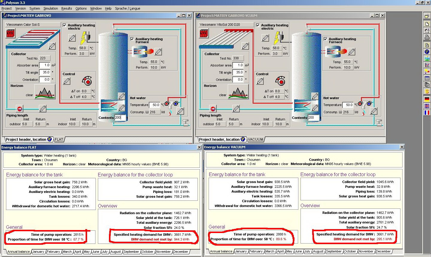 1.Нетна площ 1 м2 , вакуум-тръбен и плосък колектор.С осреднен годишен енергодобив /PLOYSUN/